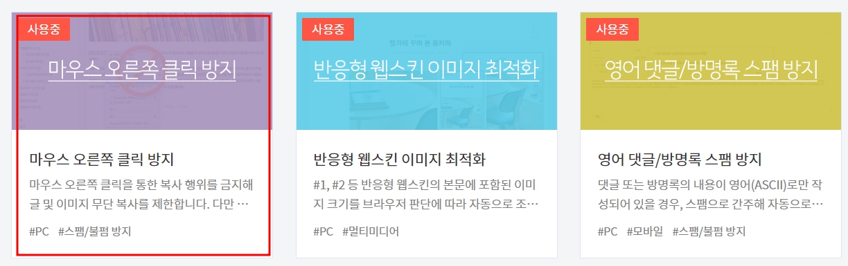 플러그인에 다양한 기능을 추가해도 되겠지만, <마우스 우측 클릭 방지>를 선택해 줍니다. 왜냐 하면 이 기능을 선택함으로 인해 불법 복사를 막을 수 있습니다.