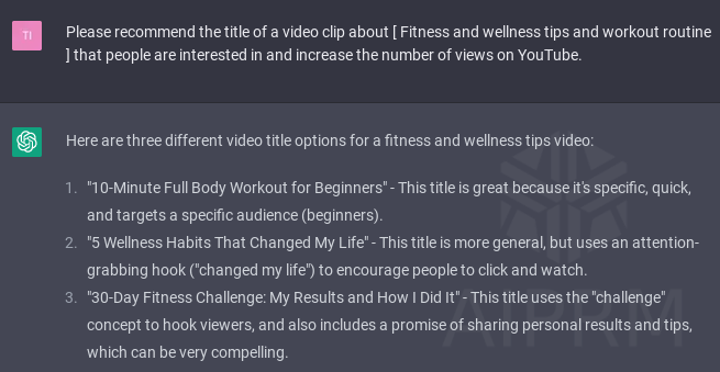 지금까지 chatGPT로 유튜브 채널의 주제를 선정 완료하였으니, 사람들의 시선과 주목을 끄는 제목을 만들어 보겠습니다. "사람들이 관심을 가지고, 유튜브의 조회수를 높일 수 있는 [특정 주제] 에 대한 비디오 클립의 제목을 추천해줘" 라고 입력합니다.